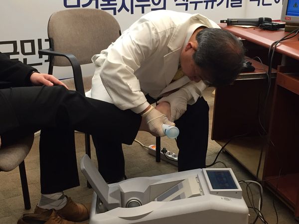 이날 김 회장은 골밀도측정기를 직접 사용하는 모습을 보인 뒤 “오늘 의료기기를 사용했다. 나부터 고발해라. 나를 고발하면 법정에서 관련된 내용을 이야기하고 법적인 판단을 받겠다”고 강조했다.김필건 대한한의사협회장이 골밀도기를 직접 시연하고 있다. <사진=민승기 기자>