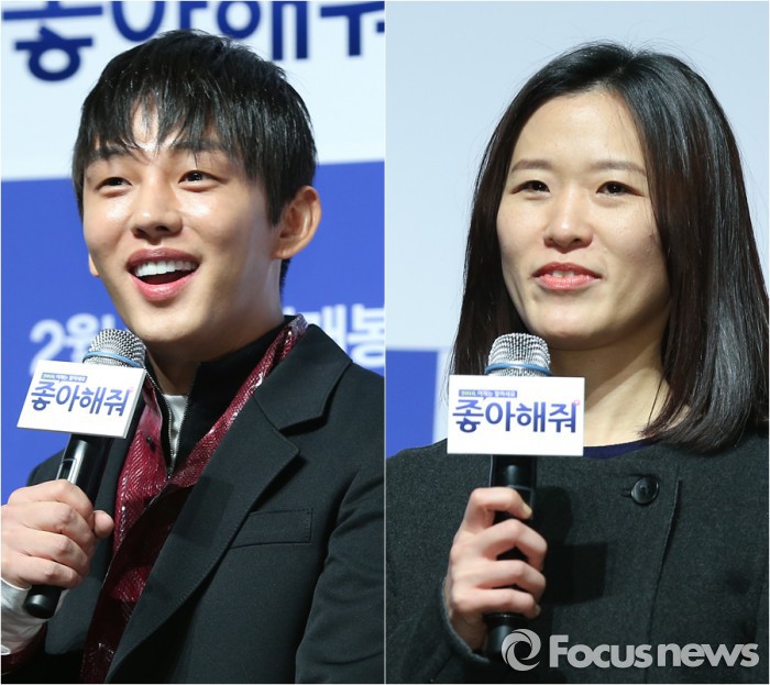 영화 '좋아해줘'는 SNS를 통해 사랑을 키워가는 여섯 남녀의 이야기를 담았다. 스타작가 조경아(이미연 분)와 인기스타 노진우(유아인 분), 사랑 잃은 노총각 정성찬(김주혁 분)과 집 잃은 노처녀 함주란(최지우 분), 연애 초보 작곡가 이수호(강하늘 분)와 연애 고수 PD 장나연(이솜 분)이 각 이야기의 주인공이다. 오는 2월18일 개봉한다.<서울=포커스뉴스> 배우 유아인(왼쪽)과 박현진 감독이 12일 열린 영화 '좋아해줘' 제작보고회에서 질의응답에 응하고 있다. 김유근 기자.