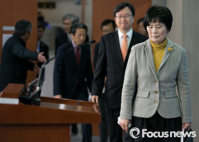 (서울=포커스뉴스) 12일 오전 서울 여의도 국회 정론관에서 조은 더불어민주당 선출직공직자평가위원장과 위원들이 19대 국회의원 평가 종료 기자회견을 위해 입장하고 있다.