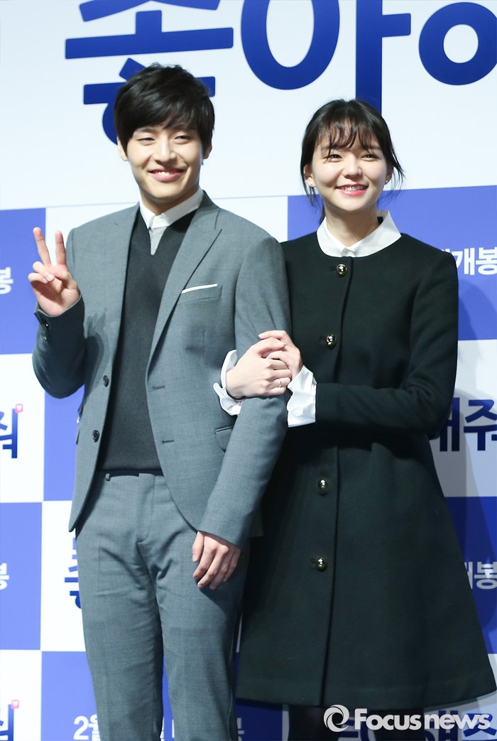 (서울=포커스뉴스) 12일 오전 서울 강남구 압구정 CGV에서 열린 영화 '좋아해줘' 제작보고회에 참석한 배우 강하늘(왼쪽)과 이솜이 포토타임을 갖고 있다.