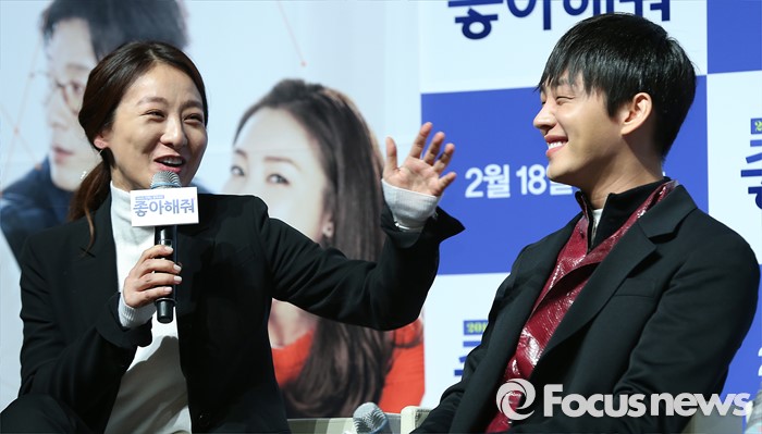 (서울=포커스뉴스) 12일 오전 서울 강남구 압구정 CGV에서 열린 영화 '좋아해줘' 제작보고회에 참석한 배우 이미연(왼쪽)이 배역에 대한 설명을 하고 있다.