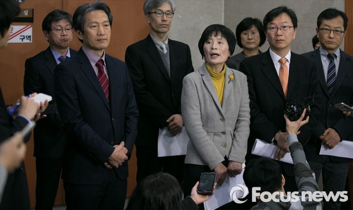 (서울=포커스뉴스) 12일 오전 서울 여의도 국회 정론관에서 조은 더불어민주당 선출직공직자평가위원장과 위원들이 19대 국회의원 평가 종료 기자회견을 마친 뒤 취재진 질문에 답하고 있다.