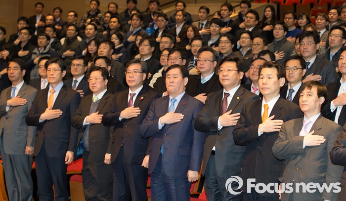 (세종=포커스뉴스) 최경환 경제부총리 겸 기획재정부장관이 12일 오후 세종시 정부세종청사 대강당에서 열린 이임식에서 국기에 대한 경례를 하고 있다.