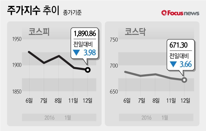 12일 코스피지수는 전일 대비 0.21%(3.98포인트) 내린 1890.86에 장을 마쳤다. 코스닥지수는 전날 보다 0.54%(3.66포인트) 하락한 671.30에 마감했다.