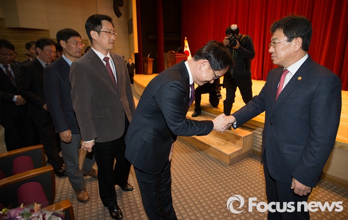 (세종=포커스뉴스) 윤상직 산업통상자원부장관이 12일 오후 세종시 정부세종청사 산업통상자원부 대강당에서 열린 이임식에서 직원과 작별 인사를 하고 있다.