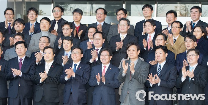 (세종=포커스뉴스) 윤상직 산업통상자원부장관이 12일 오후 세종시 정부세종청사 산업통상자원부 대강당에서 열린 이임식을 마치고 직원들과 기념촬영을 하고 있다.