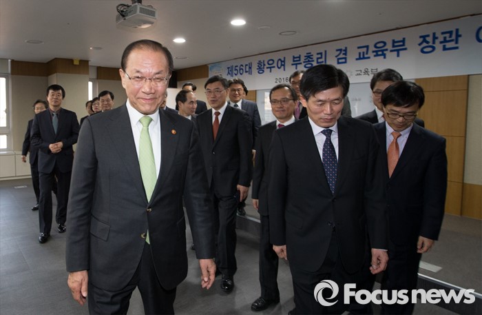 (세종=포커스뉴스) 황우여 사회부총리 겸 교육부장관이 12일 오후 세종시 정부세종청사 교육부 대회의실에서 열린 이임식을 마치고 청사를 나서고 있다.