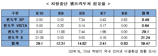 또 IE 제품의 취약점을 이용한 악성코드를 발견하는 즉시, 전용백신을 제작하여 보호나라 홈페이지를 통해 보급할 예정이다.지원중단 웹브라우저 점유율.<표제공=미래부>