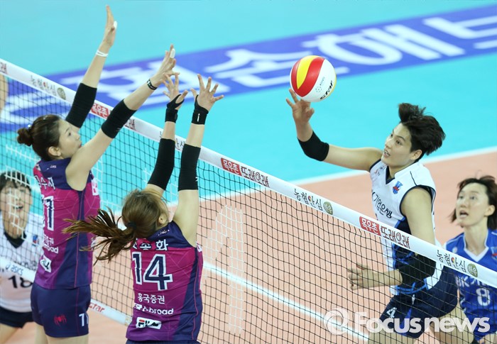 (인천=포커스뉴스) 12일 인천 계양체육관에서 열린 '2015-2016NH농협 V-리그' 여자부 흥국생명-IBK기업은행 경기에서 IBK기업은행 김희진(4)이 흥국생명 김수지(11), 조송화의 블로킹을 피해 연타로 볼을 밀어 넣고 있다.