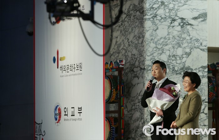 (서울=포커스뉴스) 12일 오후 서울 강남구 그랜드 인터컨티넨탈 호텔에서 한국이미지커뮤니케이션연구원(CICI) 주최로 열린 '12회 한국이미지상 시상식'에 한국 이미지 디딤돌상을 수상한 싸이가 소감을 밝히고 있다.