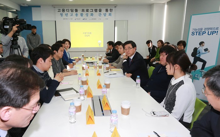 (서울=포커스뉴스) 이기권 고용노동부장관이 12일 오후 경기 성남시 분당구 삼평동 카카오 판교오피스에서 열린 고용디딤돌 간담회에 참석, 고용디딤돌 프로그램 참여기업 관계자 및 참여청년들과 간담회를 갖고 있다. <사진제공=고용노동부>
