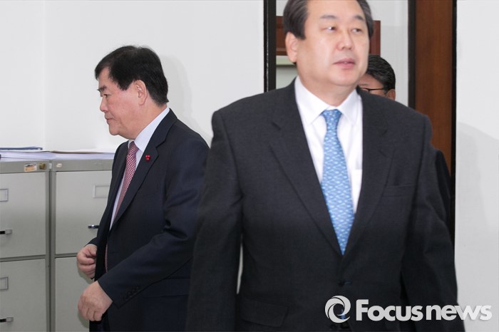 (서울=포커스뉴스) 최경환(왼쪽) 전 경제부총리 겸 기획재정부 장관이 13일 오전 서울 여의도 국회 새누리당 대표최고위원실에서 김무성 대표와 면담을 마친 뒤, 밖으로 나가고 있다.