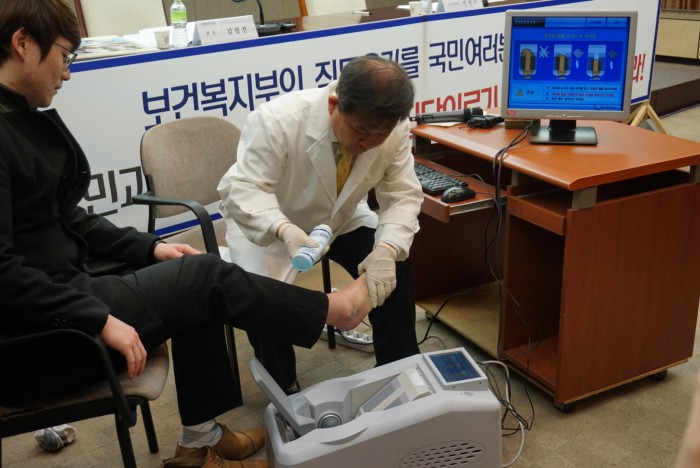 김필건 회장 역시 “한의사 의료기기 사용 문제의 해결을 위해 잡혀갈 때까지 의료기기 사용을 멈추지 않을 것”이라는 의지를 표명했다.김필건 대한한의사협회장이 골밀도측정기를 시연하고 있는 모습. <사진출처=대한한의사협회>