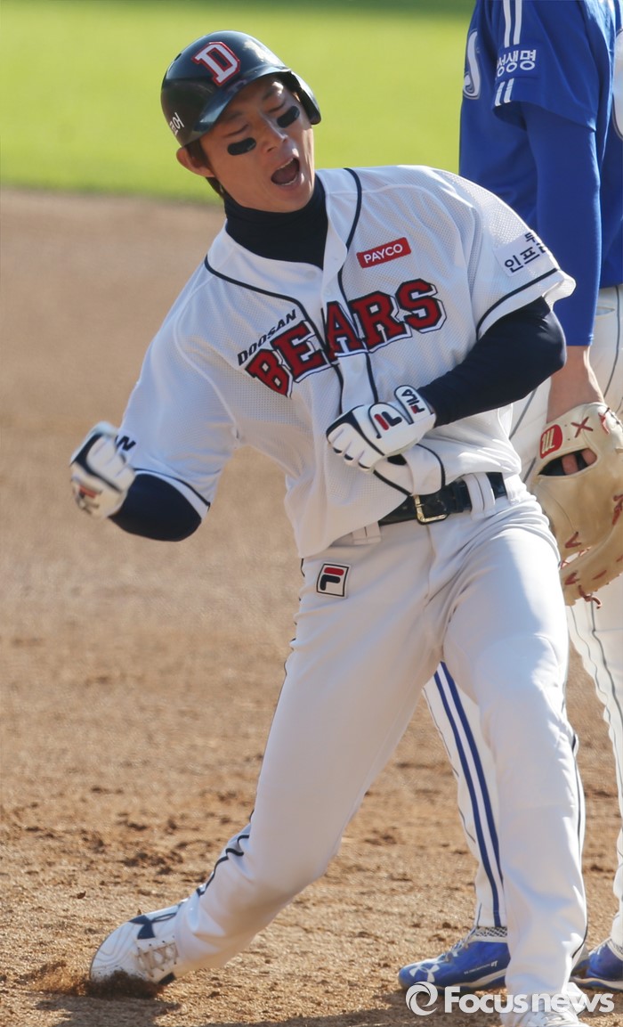 고영민은 지난 2001년 두산에서 프로 데뷔했다. 지난 시즌 41경기 타율 3할2푼8리 3홈런 11타점을 기록했다. 통산 성적은 871경기 타율 2할5푼2리 46홈런 291타점 133도루다.(서울=포커스뉴스) 31일 잠실구장에서 열린 2015 프로야구 포스트시즌 삼성-두산 한국시리즈 5차전, 3회 2사 만루에서 두산 고영민이 2타점 좌중간 안타를 치고 1루에서 환호하고 있다. 2015.10.31 우정식 기자
