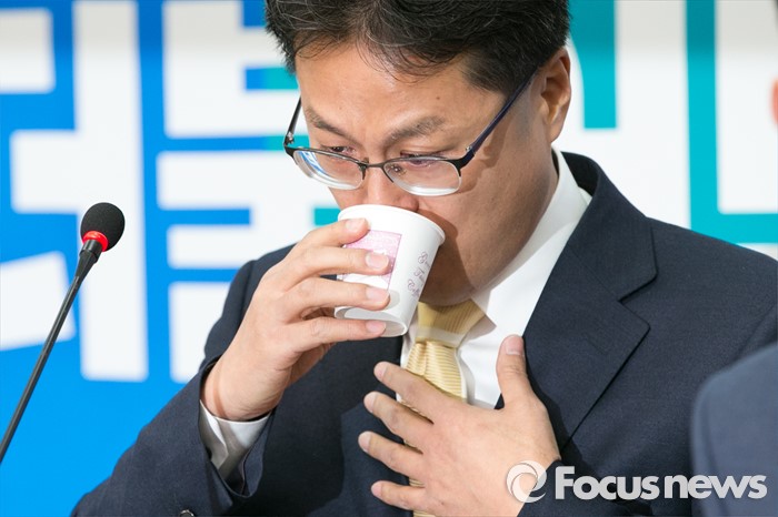 (서울=포커스뉴스) 재정부 국고국 과장을 역임한 국가재정 전문가 김정우 세종대 교수가 13일 오전 서울 여의도 국회 더불어민주당 대표회의실에서 입당 기자회견을 하며 물을 마시고 있다. 김 교수의 부친은 김철배 더민주 강원도당 고문으로 12대 총선부터 15대 총선까지 5번(보선 1회 포함)을 철원, 화천, 양구 지역에서 범민주당의 이름으로 출마해, 5번 내리 낙선했다.