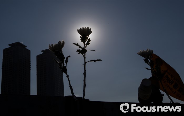 (서울=포커스뉴스) 13일 오전 서울 용산구 남일당 주차장에서 열린 '용산참사 7주기 추모주간 선포' 기자회견에 참석한 용산참사7주기 추모위원회이 옛 남일당터 울타리에 꽃아놓은 국화.