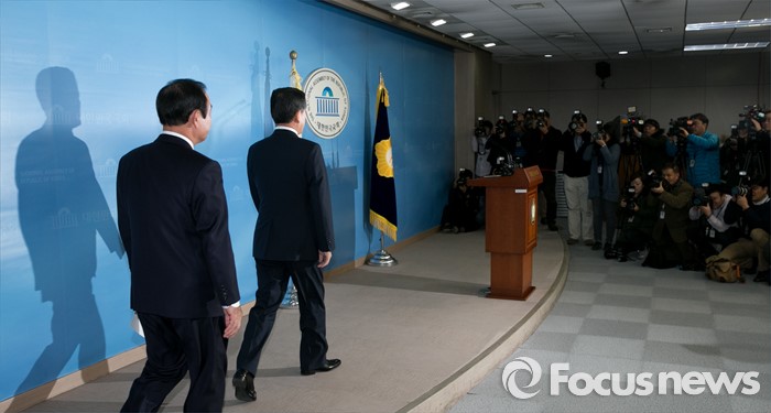 (서울=포커스뉴스) 13일 오전 서울 여의도 국회 정론관에서 장병완(왼쪽), 주승용 더불어민주당 의원이 탈당 기자회견을 위해 입장하고 있다.