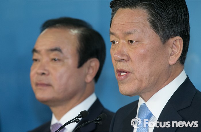 (서울=포커스뉴스) 13일 오전 서울 여의도 국회 정론관에서 장병완(왼쪽), 주승용 더불어민주당 의원이 탈당 기자회견을 하고 있다.