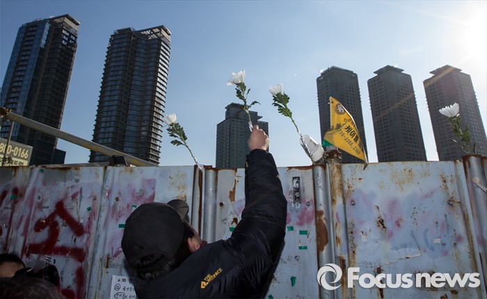 (서울=포커스뉴스) 13일 오전 서울 용산구 남일당 주차장에서 열린 '용산참사 7주기 추모주간 선포' 기자회견에 참석한 용산참사7주기 추모위원회원이 옛 남일당터 울타리에 국화를 바치고 있다.