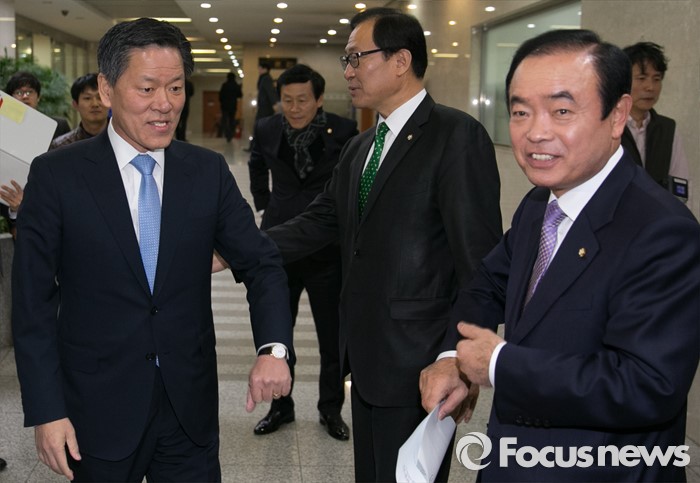 (서울=포커스뉴스) 13일 오전 서울 여의도 국회 정론관에서 장병완(오른쪽), 주승용(왼쪽) 더불어민주당 의원이 탈당 기자회견에 앞서 탈당 후 국민의당에 합류한 문병호(가운데) 의원과 인사한 뒤 이동하고 있다.