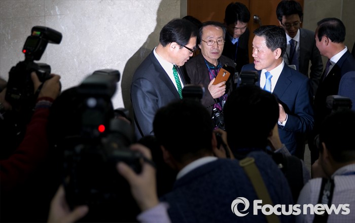 (서울=포커스뉴스) 13일 오전 서울 여의도 국회 정론관에서 주승용(오른쪽) 더불어민주당 의원이 탈당 기자회견을 마친 뒤 먼저 탈당 후 국민의당에 합류한 문병호 의원과 인사하고 있다.