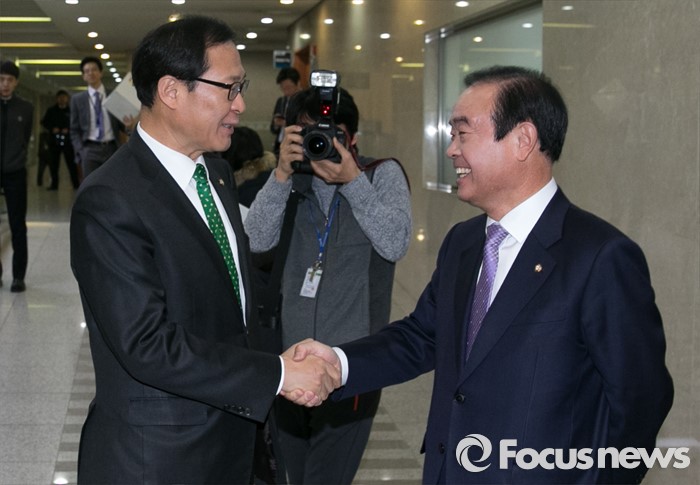 (서울=포커스뉴스) 13일 오전 서울 여의도 국회 정론관에서 장병완(오른쪽) 더불어민주당 의원이 탈당 기자회견에 앞서 탈당 후 국민의당에 합류한 문병호 의원과 인사하고 있다.
