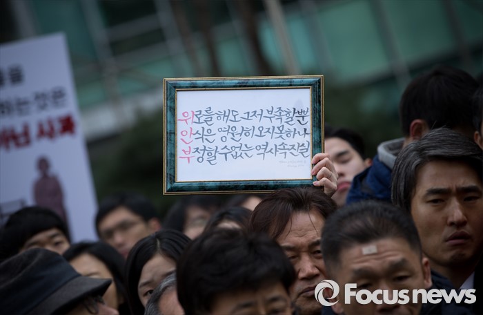 (서울=포커스뉴스) 13일 오후 서울 종로구 구 일본대사관 앞에서 열린 제1213차 일본군 위안부 문제해결을 위한 정기수요집회에서 참가자들이 손피켓을 들고 있다.