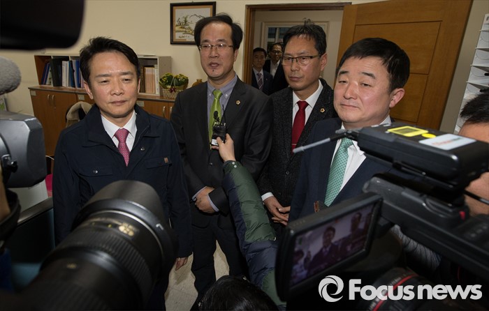 (서울=포커스뉴스) 누리과정 예산을 포함한 올해 예산안 심의를 위한 임시회 본회의 예정일인 13일 오전 경기도의회에서 남경필(왼쪽부터) 경기도지사, 김현삼 경기도의회 더불어민주당 대표의원, 이승철 경기도의회 새누리당 대표의원, 강득구 경기도의회 의장이 회담을 마친 후 취재진의 질문에 답변을 하고 있다.