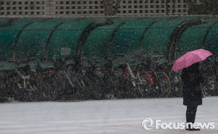 (서울=포커스뉴스) 서울을 포함한 중부지방에 많은 눈이 내린 13일 오후 서울 성북구 길음역 근처에서 한 시민이 우산을 쓰고 있다.