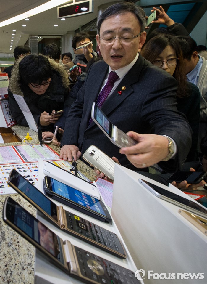 (서울=포커스뉴스) 13일 오후 서울 중구 중앙우체국 알뜰폰 판매창구를 찾은 최성준 방송통신위원장이 휴대폰을 살펴보고 있다.