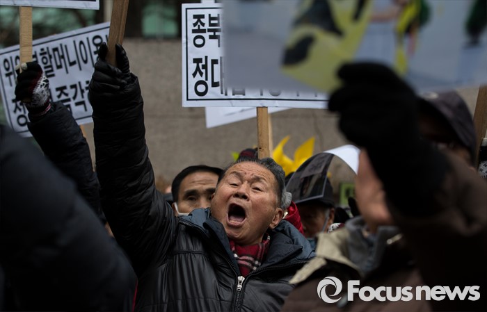 (서울=포커스뉴스) 13일 오후 서울 종로구 구 일본대사관 앞에서 어버이연합이 한국정신대문제대책협의회를 비난하는 기자회견을 하고 있다.