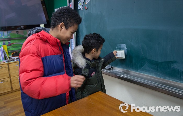 (서울=포커스뉴스) 13일 오후 서울 용산구 이태원초등학교에서 국내거주 외국인 부모를 둔 중학생 에드워드 위키가 초등학교 입학을 앞둔 동생 리차드 위키와 함께 교실을 둘러보고 있다.