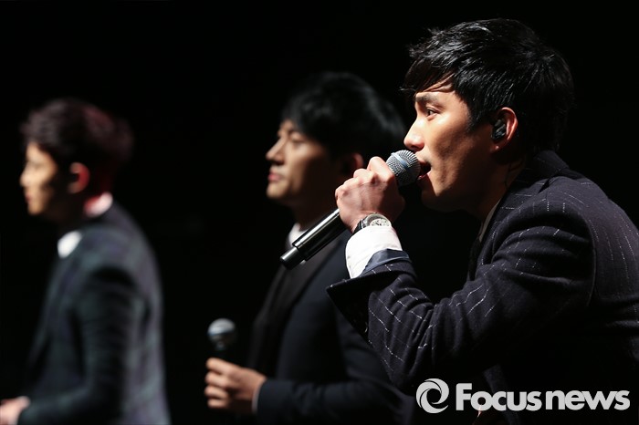 (서울=포커스뉴스) 13일 오후 서울 강남구 일지아트홀에서 열린 남성 3인조 그룹 V.O.S의 미니앨범 'Re:Union, The Real' 쇼케이스에 참석한 멤버 김경록(오른쪽)이 신곡 '그날'의 무대를 선보이고 있다.