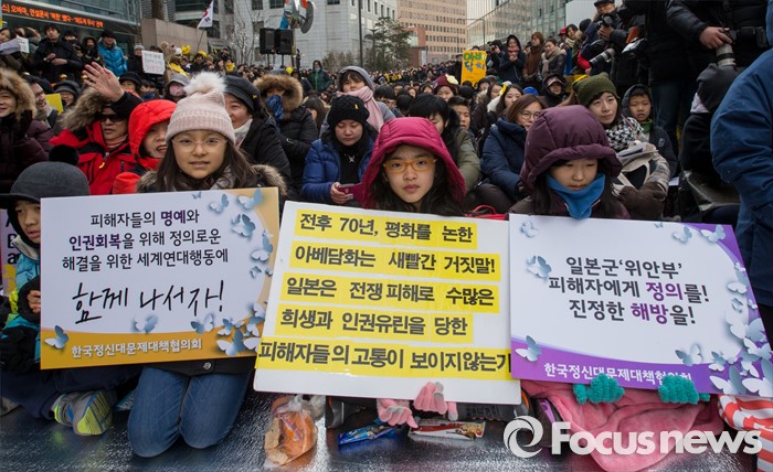 (서울=포커스뉴스) 13일 오후 서울 종로구 옛 일본대사관 앞에서 열린 제1213차 정기수요집회에 참석한 어린이들이 일본의 공식 사과와 법적 책임을 요구하는 팻말을 들고 있다.