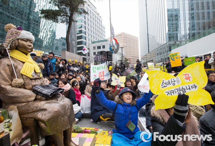 (서울=포커스뉴스) 13일 오후 서울 종로구 옛 일본대사관 앞에서 열린 제1213차 정기수요집회에서 참석자들이 일본의 공식 사과와 법적 책임을 요구하는 구호를 외치고 있다.