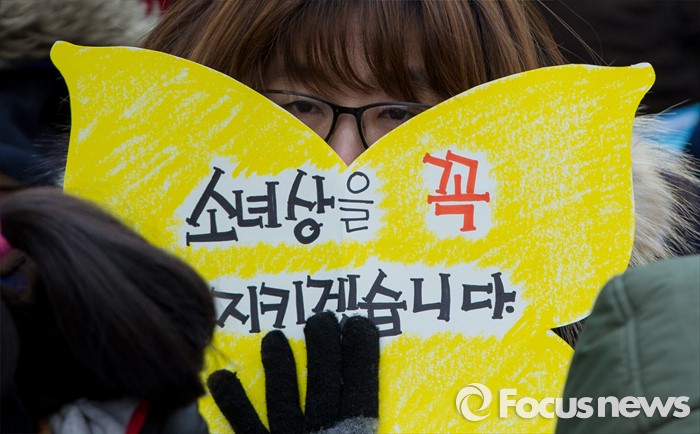 (서울=포커스뉴스) 13일 오후 서울 종로구 옛 일본대사관 앞에서 열린 제1213차 정기수요집회에서 한 참석자가 '소녀상을 꼭 지키겠습니다'라는 문구가 적힌 손팻말을 들고 있다.