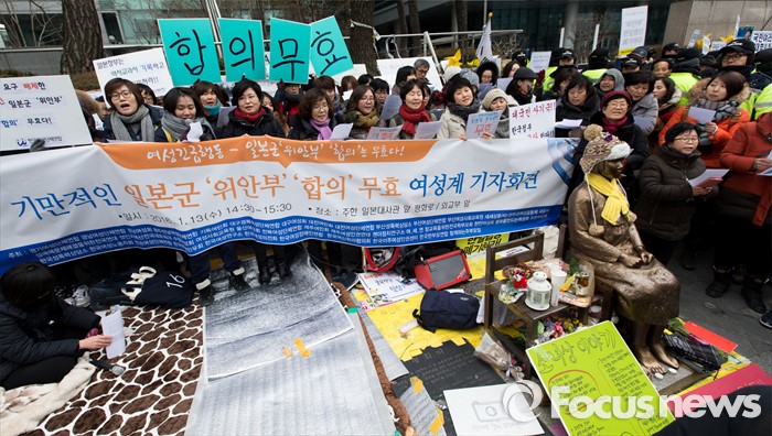 (서울=포커스뉴스) 13일 오후 서울 종로구 구 일본대사관 앞에서 한국여성단체연합이 한일 일본군 위안부 합의 규탄 기자회견을 하고 있다.