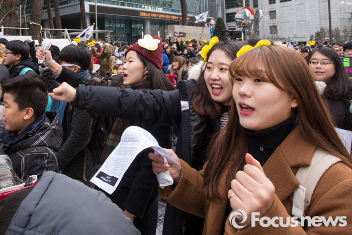 (서울=포커스뉴스) 13일 오후 서울 종로구 옛 일본대사관 앞에서 열린 제1213차 정기수요집회에서 참석자들이 일본의 공식 사과와 법적 책임을 요구하는 구호를 외치고 있다.