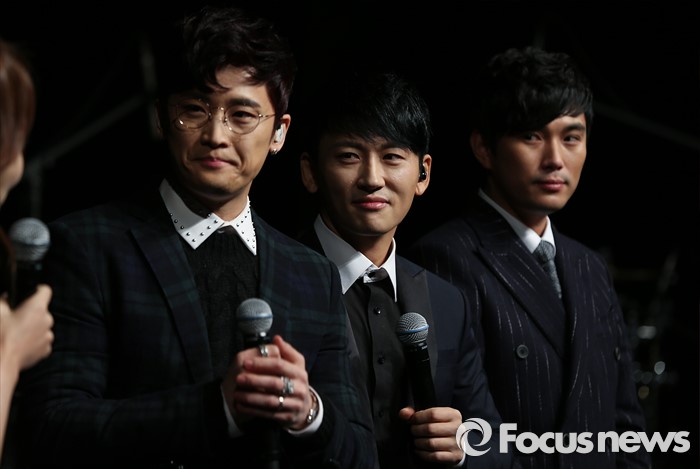 (서울=포커스뉴스) 13일 오후 서울 강남구 일지아트홀에서 열린 남성 3인조 그룹 V.O.S의 미니앨범 'Re:Union, The Real' 쇼케이스에 참석한 멤버 최현준(왼쪽부터), 박지헌, 김경록이 사회자에게 질문을 받고 있다.