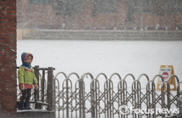 (서울=포커스뉴스) 서울을 포함한 중부지방에 많은 눈이 내린 13일 오후 서울 강북구 미아초등학교 앞에서 한 어린이가 눈을 바라보고 있다.