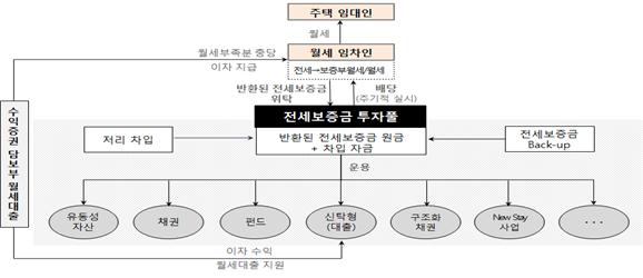 이에 금융위는 민간연기금 규모의 전세보증금 투자풀(모펀드)을 만들고 다양한 하위펀드에 자금을 적절히 배분, 주기적으로 배당금을 지급하는 방향을 모색 중이라고 말했다.<자료제공=금융위원회>