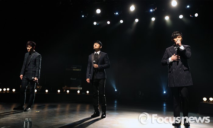 (서울=포커스뉴스) 13일 오후 서울 강남구 일지아트홀에서 열린 남성 3인조 그룹 V.O.S의 미니앨범 'RE:Union, The Real' 쇼케이스에 참석한 멤버 최현준(왼쪽부터), 박지헌, 김경록이 신곡 '그날'의 무대를 선보이고 있다.