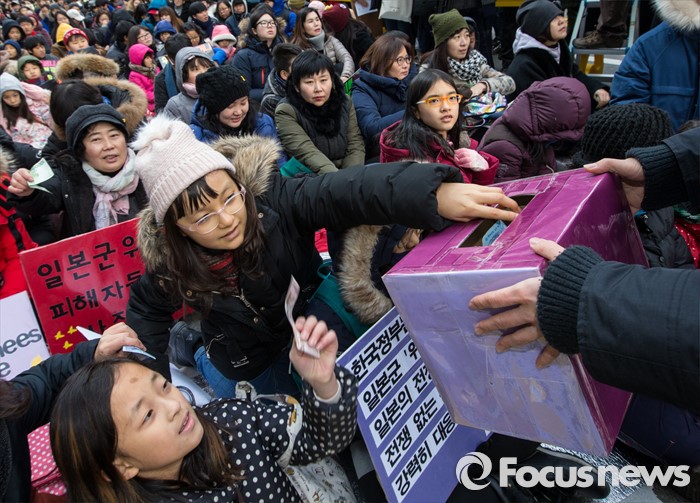 (서울=포커스뉴스) 13일 오후 서울 종로구 옛 일본대사관 앞에서 열린 제1213차 정기수요집회에 참석한 어린이들이 모금함에 돈을 넣고 있다.