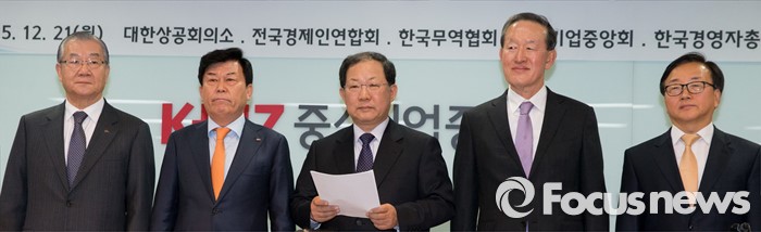 중소기업중앙회도 “대내외 경제환경의 불확실성이 증가함에 따라 우리 중소기업의 경영여건도 매우 절박한 상황”이라며 “지금의 경제위기를 슬기롭게 극복하기 위해 뼈를 깎는 선제적 개혁 노력이 중요한 만큼, 노동개혁 법안과 경제활성화법안의 조속한 통과가 수반되어야 할 것”이라고 강조했다.(서울=포커스뉴스) 21일 오전 서울 영등포구 중소기업중앙회에서 열린 '노동개혁 입법 촉구를 위한 경제5단체 긴급 기자회견'에서 박병원(가운데) 한국경영자총협회장이 성명서를 발표하고 있다. 왼쪽부터 김인호 한국무역협회 회장, 박성택 중소기업중앙회 회장, 박병원 한국경영자총협회 회장, 허창수 전국경제인연합회 회장, 이동근 대한상공회의소 부회장. 2015.12.21 허란 기자