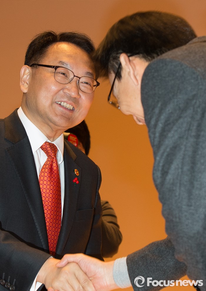 (세종=포커스뉴스) 유일호 신임 경제부총리 겸 기획재정부장관이 13일 오후 세종시 정부세종청사 대강당에서 열린 취임식에 참석해 직원과 악수를 하고 있다.