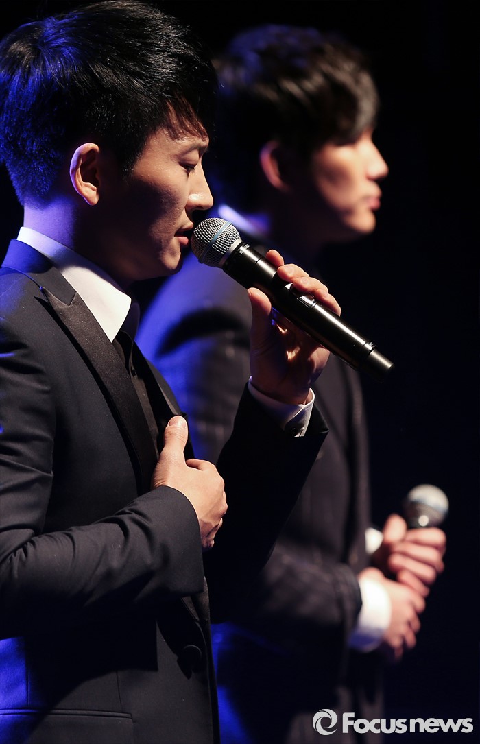 (서울=포커스뉴스) 13일 오후 서울 강남구 일지아트홀에서 열린 남성 3인조 그룹 V.O.S의 미니앨범 'Re:Union, The Real' 쇼케이스에 참석한 멤버 박지헌(왼쪽)이 신곡 '그 사람이 너니까' 의 무대를 선보이고 있다.