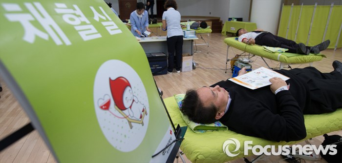 (세종=포커스뉴스) 13일 오후 세종시 정부세종청사 1동 대강당에서 열린 '국무총리실과 함께하는 사랑의 헌혈' 에 국무총리실 직원들이 헌혈을 하고 있다.