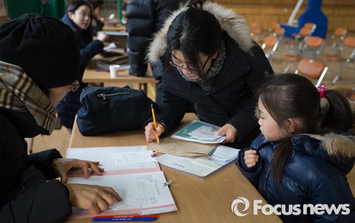 (서울=포커스뉴스) 초등학교 신입생 예비소집일인 13일 오후 서울 용산구 이태원초등학교에서 예비 초등학생 자녀와 함께 온 엄마가 입학 서류를 작성하고 있다.