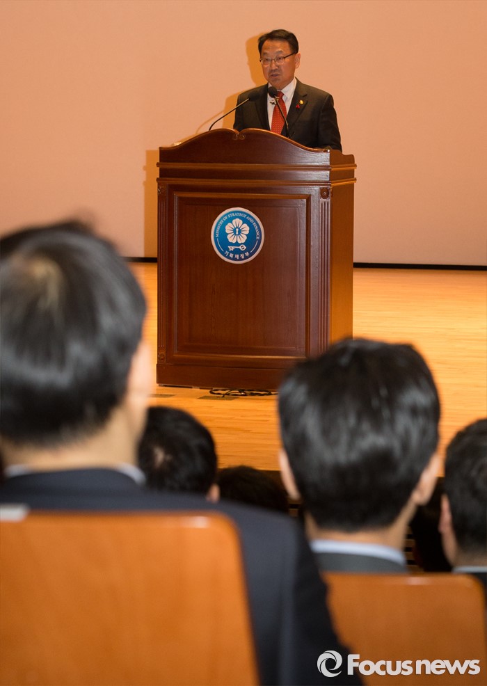 (세종=포커스뉴스) 유일호 신임 경제부총리 겸 기획재정부장관이 13일 오후 세종시 정부세종청사 대강당에서 열린 취임식에 참석해 취임사를 하고 있다.