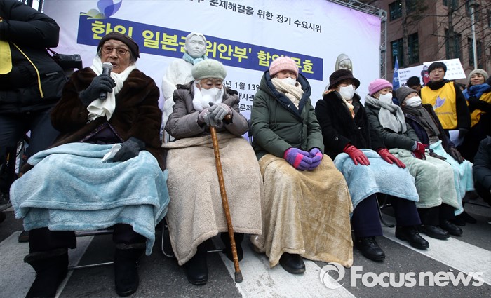 (서울=포커스뉴스) 13일 오후 서울 종로구 옛 일본대사관 앞에서 열린 제1213차 일본군 위안부 피해자 문제 해결 위한 정기 수요시위에 자리한 김복동 할머니가 발언 하고 있다.